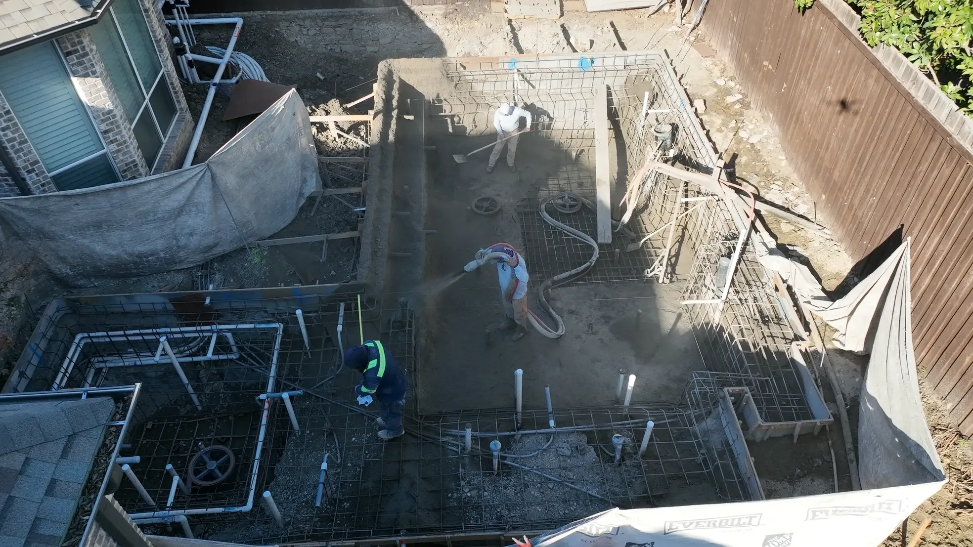 As the drone smoothly transitions to the backyard, the scene shifts dramatically. Here, amidst a flurry of activity, the crew is hard at work. The drone captures every dynamic angle of the gunite being skillfully shot into a forming pool structure, highlighting the precision and expertise of the crew.