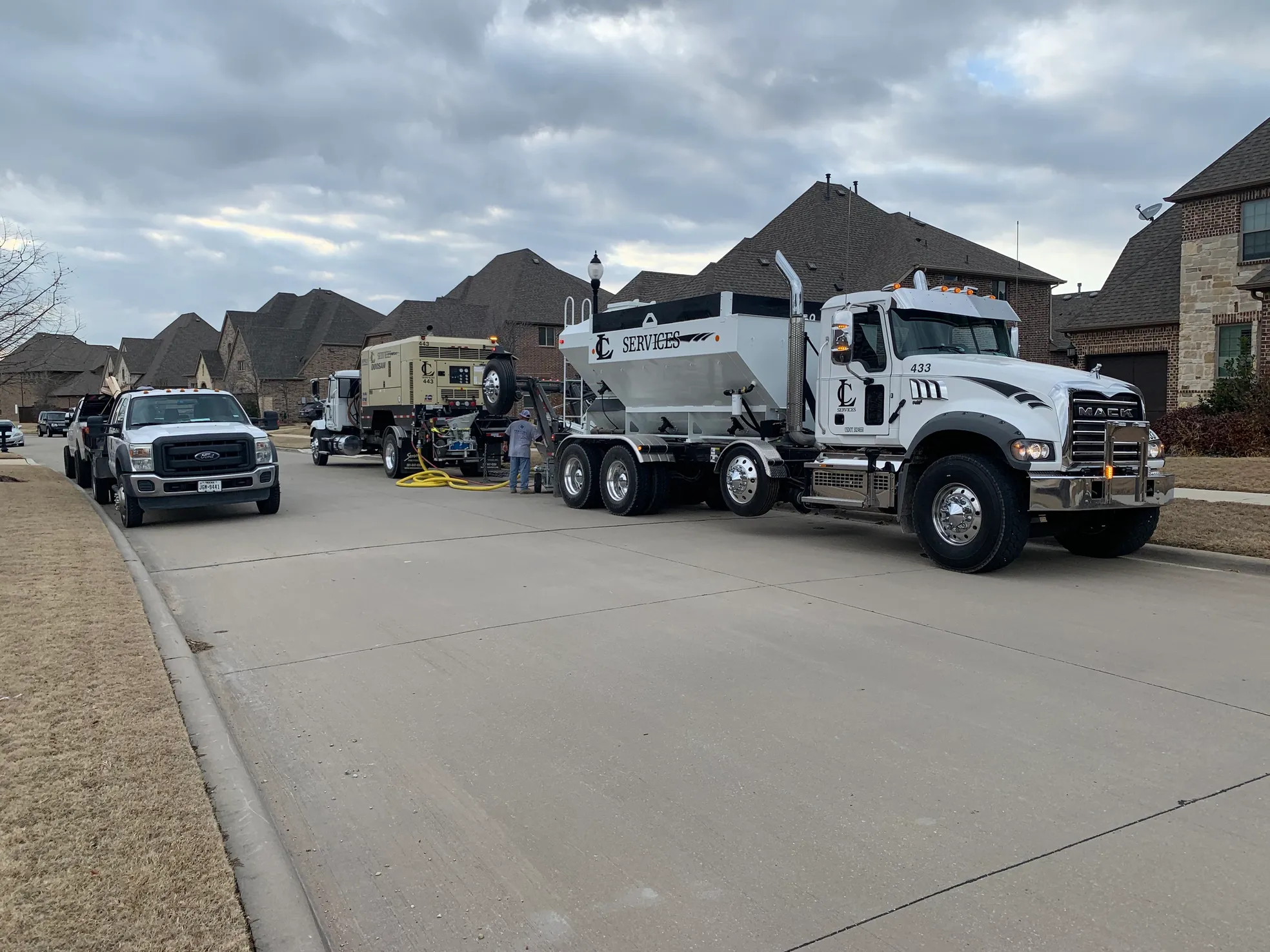 The video opens with a bird’s-eye view, courtesy of a drone. It glides effortlessly over the neighborhood, capturing the tranquil morning in a residential area. The focus shifts to a specific house, zooming in on a fleet of trucks parked out front. These aren’t just any trucks – they’re the vital gear of a professional gunite crew, ready for action.